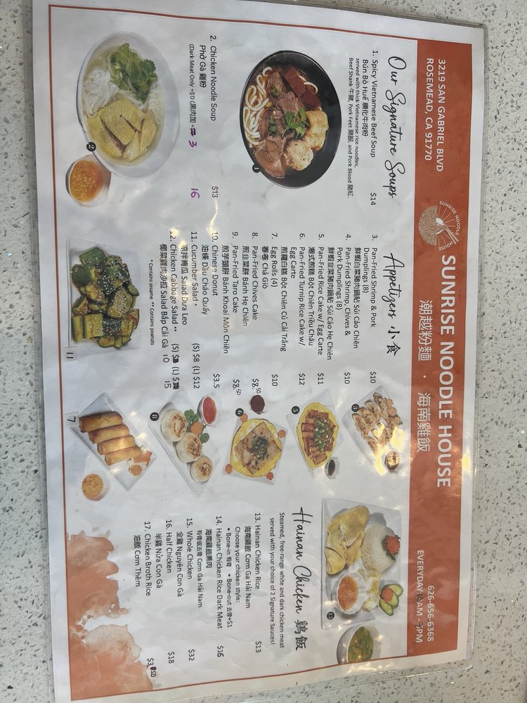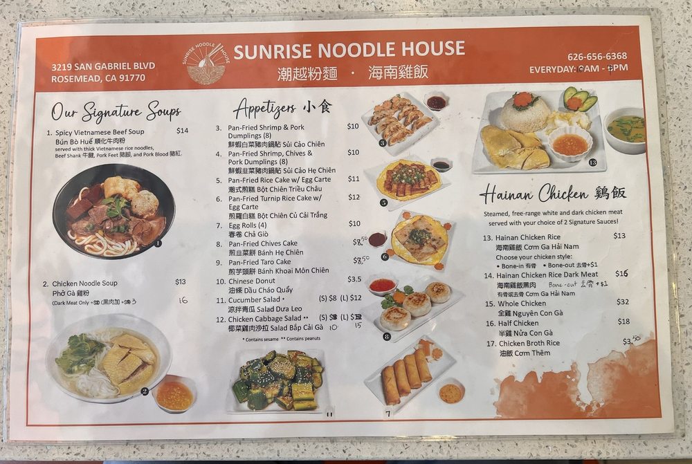 Welcome to Sunrise Noodle House, a vibrant Vietnamese-Chinese eatery located in the heart of Rosemead. Here, you can indulge in a carefully curated menu that showcases the best of both culinary traditions. Start your meal with delightful appetizers like Pan Fried Shrimp Pork Dumplings or Egg Rolls, setting the stage for the star attractions.